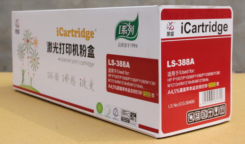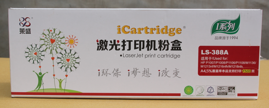 品牌萊盛I系列打印頁數(shù)1500頁型號LSIC-CC388A打印幅面A4(5%覆蓋率)顏色黑色保質期18個月適用于惠普P1007/P1008/1106/1108/1213/1136/M126a/M128打印機